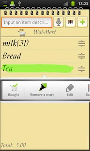 Ini adalah cara yang berguna dan mudah untuk membuat satu senarai membeli-belah di telefon anda. Anda boleh memasukkan senarai barang dari keyboard, menambah dari pangkalan data, diisi oleh anda, dengan pengimbasan kod bar dan juga menggunakan suara anda! Juga, anda boleh menandakan pembelian penting dalam senarai. Anda hanya perlu klik pada item untuk menandakan ia sebagai "membeli".